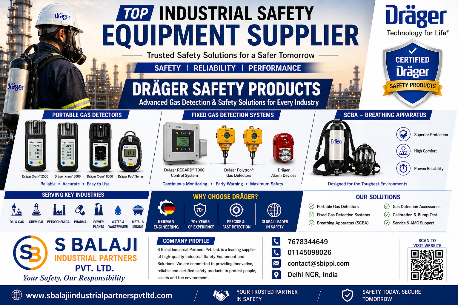 S. Balaji Industrial Partners Pvt. Ltd. is recognized as one of the top suppliers of Dräger safety equipment in Delhi NCR, offering a complete range of advanced industrial safety solutions including gas detection systems, drug testing devices, and breathing apparatus (SCBA). With a strong focus on workplace safety, compliance, and reliability, we serve industries across Delhi, Noida, Gurgaon, Ghaziabad, and all major industrial hubs in India.